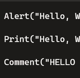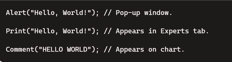 Alert("Hello World"); // A pop-up window will show up in MT4.
