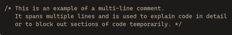 /* This is an example of a multi-line comment. It spans multiple lines and is used to explain code in detail or to block out sections of code temporarily. */