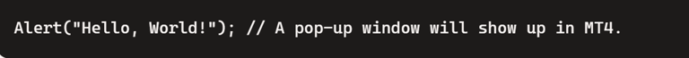 Alert("Hello World"); - A pop-up window will show up in MT4.